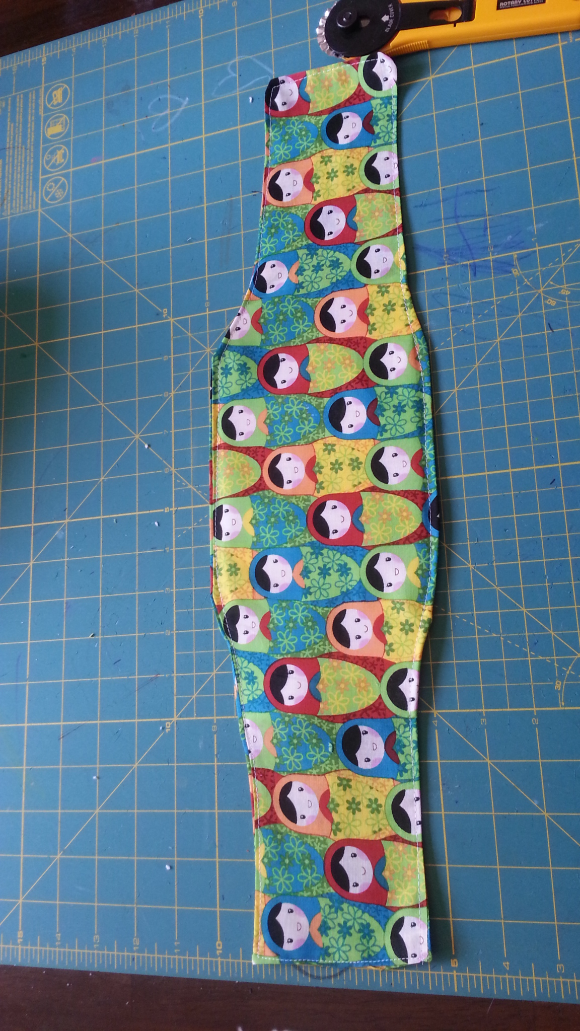 Iron the fabric out flat and smooth and then make a small cut to shape the fabric. Fold the fabric in half and make 2 cuts down each side. You want to take it in a bit towards the straps leaving the wider part for the underbelly/private area. It does not need to be a drastic change, maybe a total of 1 inch from both sides.